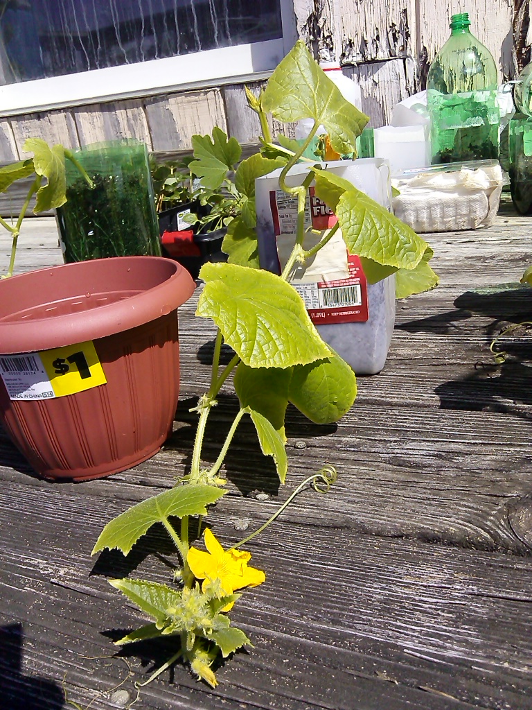 We have been showing how fast our early cucumber starts have been growing, so thought we would update. The plan is to try and see if we can get any produce out of an early batch. We were going to plant them last weekend, but as there was a forecast of frost Tuesday we will probably but out later in the week or this weekend. They are still going strong in our pop bottle and milk jug pots, though their roots are getting large.