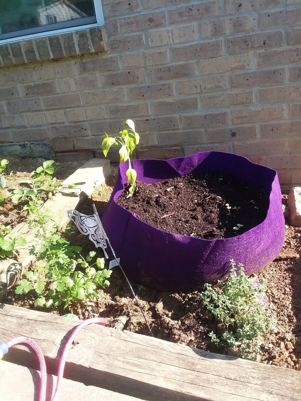 Then we have a bit of a change. For most of spring and summer it was home to two rather large squash plants. They just couldn't shake the powdery mildew and I ended up pulling them up all together. I had ordered a smart pot big garden bed mini (in purple!) for little E. She was so excited we had to plant a little right away. So we went and picked up a few plants (which turned into twice as many because it was buy one get one free). She wanted one of the peppers and then proceeded to plant some seeds for the fall. I think she planted a mix of beets, lettuce, and brassicas. We shall see when it all pops up better. In front of that is a thyme plant and a cilantro plant.